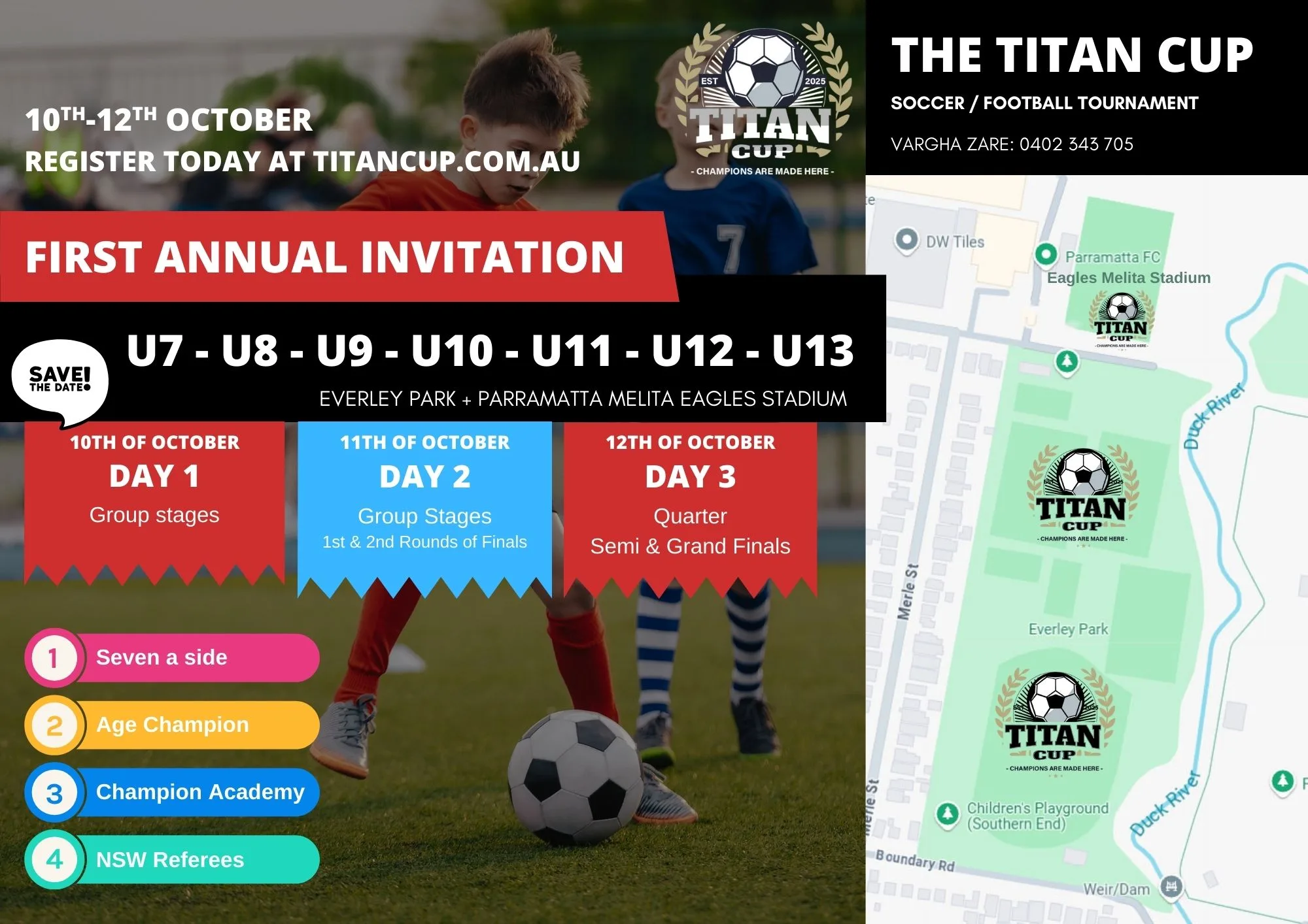 Discover thrilling seven-a-side soccer tournaments for young athletes aged Under 7 to Under 13. Experience teamwork, skill development, and a fun atmosphere at Titan Cup